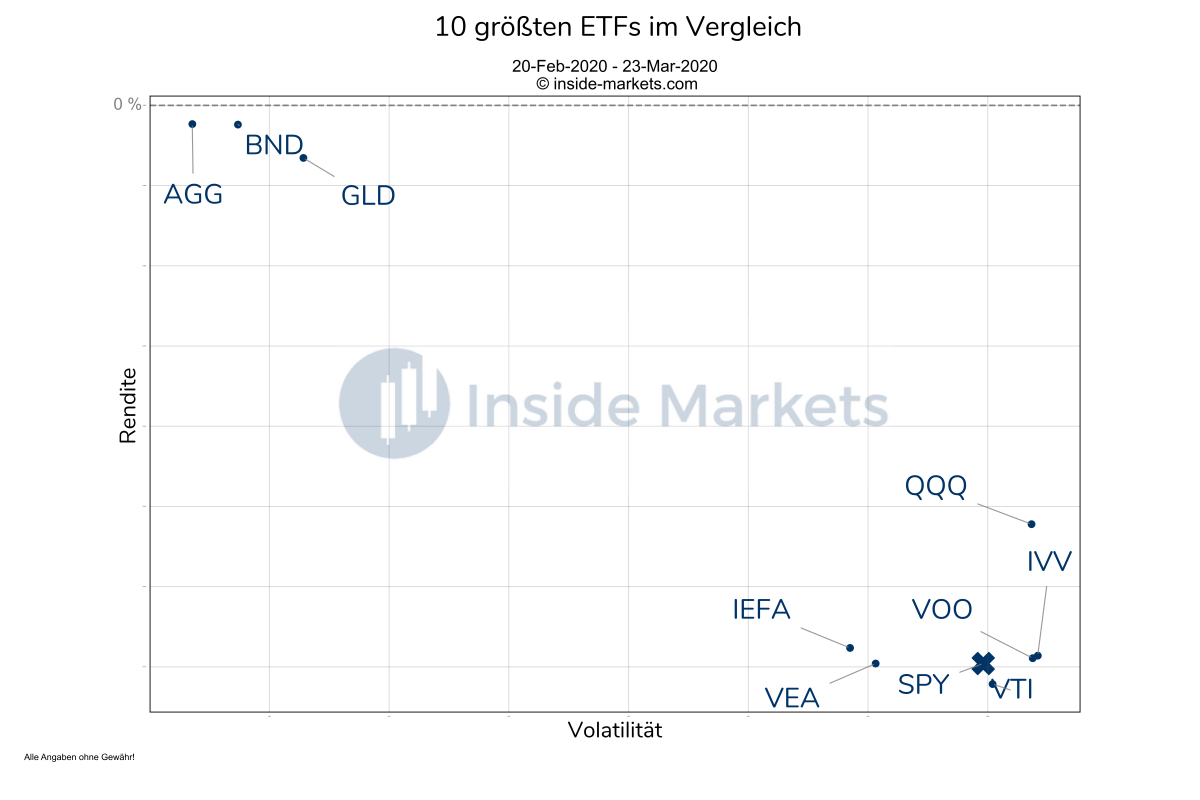 Während dieser Krise haben alle Aktien gegenüber Anleihen und Gold massiv verloren. Der Nasdaq 100-ETF hat erneut eine Outperformance gegenüber den anderen Aktien-ETFs gezeigt. Gold und die Anleihen-ETFs haben sich zwar als „sichere Häfen“ erwiesen, dennoch haben diese auch an Wert verloren.