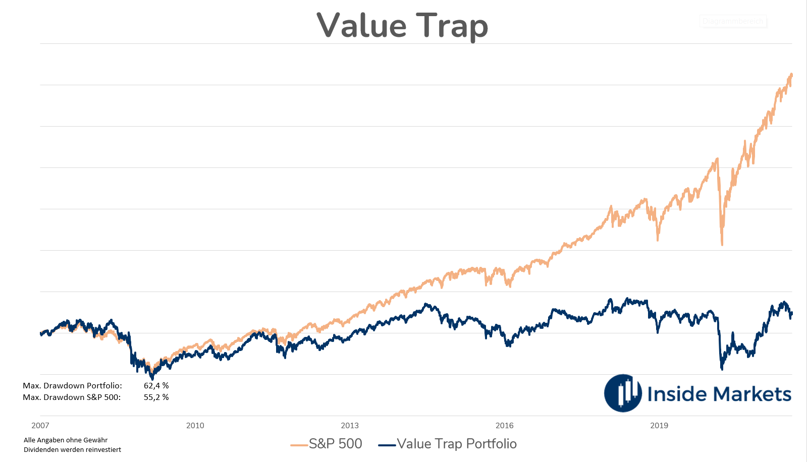 Dieses Musterdepot zeigt die Fallen des Investierens: Setzen auf mögliche Turnaround-Storys und hochvolatile Aktien. In diesem Musterdepot wird die Korrelation zwischen hoher Volatilität und niedriger Rendite deutlich. Außerdem ist der maximale Drawdown im Untersuchungszeitraum deutlich höher.